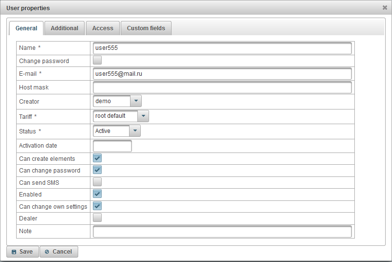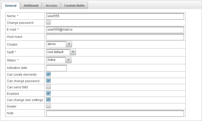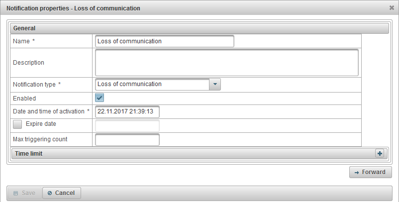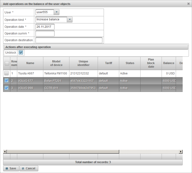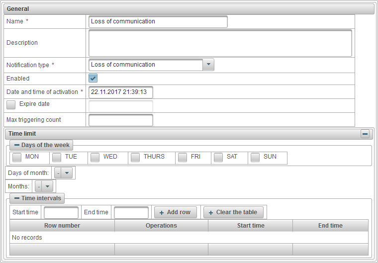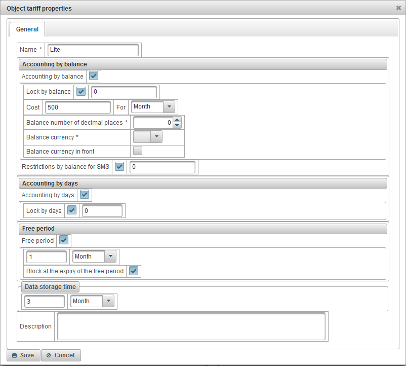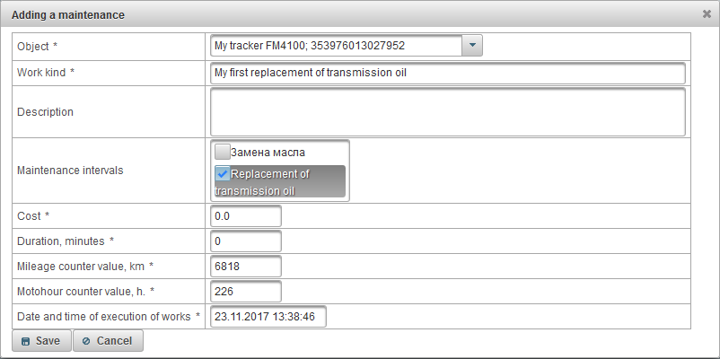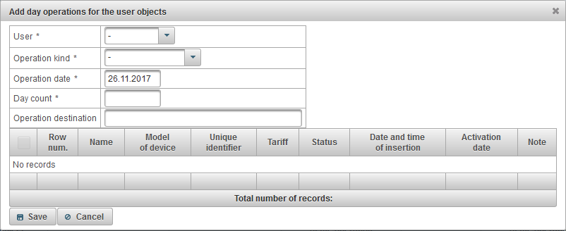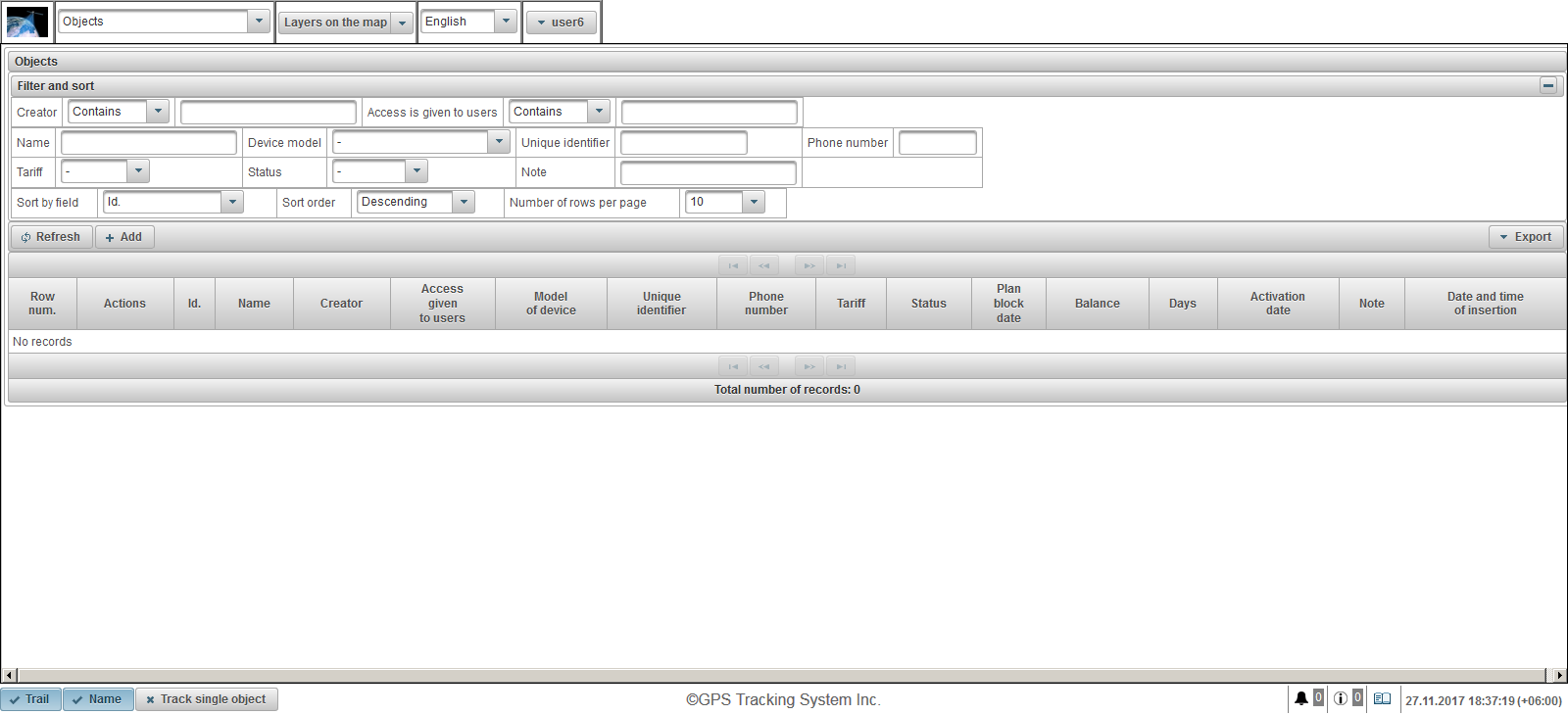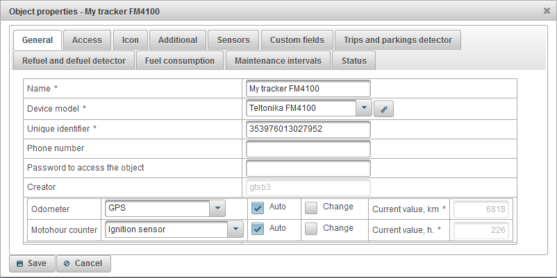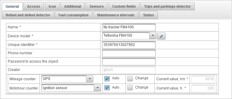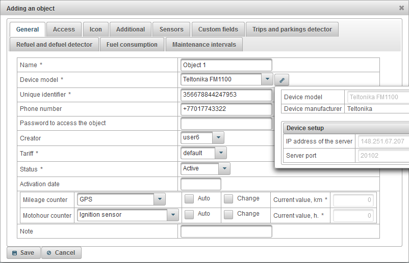 새 오브젝트를 작성하기위한 대화 상자가 열립니다. "이름"필드에 "장치 모델"필드에 개체의 이름을 입력하고 목록에서 장치 모델을 선택하고 "고유 식별자"필드에 개체의 고유 식별자 (일련 번호)를 입력합니다 , "전화 번호"필드에 장치에 삽입 된 SIM 카드의 전화 번호를 입력하십시오. 장치의 모델을 선택한 후,