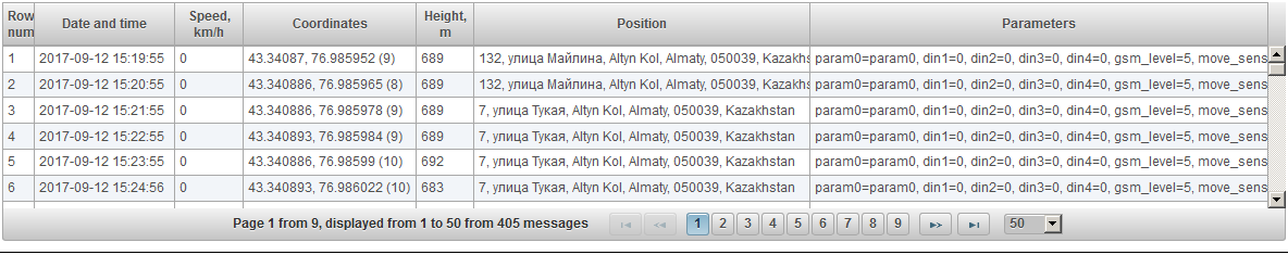 {"count":2,"messages":[{"dt":"30.06.2016T23:59:26","id":1006124,"lon":76.9858304,"trend":91,"satellite_cnt":10,"location":"132, улица Майлина, Altyn Kol, Almaty, 050039, Kazakhstan","speed":0,"alt":693,"params":"param0=param0, din1=0, din2=0, din3=0, din4=0, gsm_level=4, move_sensor=1, ain1=1175, ain2=25, ain3=18, ain4=2, ext_pwr_volt=12082, gps_pwr=1, speed=0, odom_val=0","lat":43.3409344},{"dt":"30.06.2016T23:58:25","id":1005968,"lon":76.9858496,"trend":84,"satellite_cnt":10,"location":"132, улица Майлина, Altyn Kol, Almaty, 050039, Kazakhstan","speed":0,"alt":694,"params":"param0=param0, din1=0, din2=0, din3=0, din4=0, gsm_level=4, move_sensor=1, ain1=1185, ain2=6, ain3=1, ain4=2, ext_pwr_volt=12086, gps_pwr=1, speed=0, odom_val=0","lat":43.3409312}]}