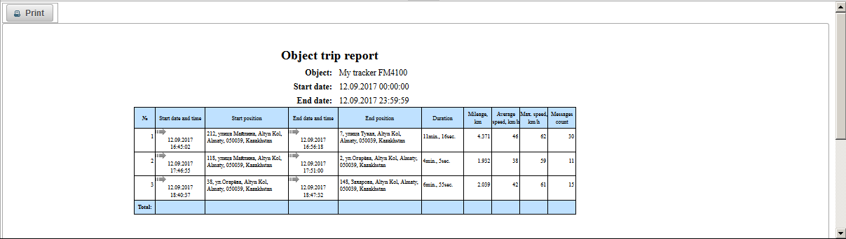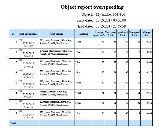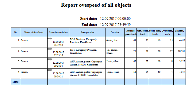 { "count": 2, "overspeeds": [{ "total_time_from_first": 0, "finish_message_dt": "01.06.2016T08 : 46 : 39", "mileage": 848, "message_id_list": [697007,697008,697009, 70, "duration_in_sec": 41, "speed_limit_in_kph": 60, "obj_id": 10524, "start_message_id": 697007, "message_cnt": 5, "duration_short_str": 41s, "avg_speed_in_kph" "finish_message_id": 697013, "start_message_location": "ул.Бухтарминская, Колхозши, 알마티 주, 카자흐스탄", "start_message_coordinates_str": "43.325904, 77.015955 (9)", "max_speed_in_kph": 76, "start_message_lat": 43.325904, "start_message_lon ": 77.0159552,"start_message_dt ":"01.06.2016T08 : 45 : 58 "}, {"total_time_from_first ": 0,"finish_message_dt ":"01.06.2016T09 : 08 : 30 ","mileage ": 427,"message_id_list " 60, "obj_id": 10524, "start_message_id": 60, "speed_limit_in_kph": 60, "obj_id": "start_message_id" : 697180, "finish_message_id": 697182, "start_message_location": "проспект Аль-Фараби, 알마티, 알마티, 알마티, 050060, 카자흐스탄 ","start_message_coordinates_str ":"43.214675, 76.923469 (9) ","max_speed_in_kph ": 65,"start_message_lat ": 43.2146752,"start_message_lon ": 76.9234688,"start_message_dt ":" 01.06.2016T09 : 08 : 06 "}]}