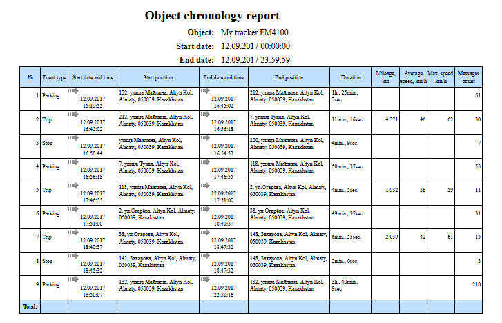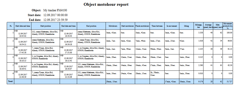 { "count": 2, "motohours": [{ "finish_motohours_in_sec": 590, "message_id_list": [697737,697738,697739,697740,697741,697742,697743,697744,697745,697746,697747,697748,697749, "start_message_id": 697737, "finish_message_lon": 76.8967104, "motohours_in_sec_str": "9min", "message_cnt": 19, "time_from_prev_end_to_cur_beg": 0, "duration_in_sec": 590, "start_message_id" , "start_message_location": "43194832, 76.893901 (5)", "start_message_lon": 76.8939008, "start_message_location": "281/1, "start_message_lt": 43.194832, "time_from_prev_end_to_cur_beg_str": ","finish_motohours_in_sec_str ":"9min. 50s ","finish_message_dt ":"01.06.2016T10 : 44 : 56 ","movement_productivity ": 89.83,"mileage ": 3397 , "start_motohours_in_sec": 0, "start_motohours_in_sec_str": "", "duration_short_str": "9min., 50s", "motohours_in_sec": 590, "avg_speed_in_kph": 34, "finish_message_coordinates_str" : "43.214048, 76.89671 (8)", "finish_message_location": "31, Baikadamov St, Баганашыл, 알마티, 알마티, 050060, 카자흐스탄", "obj_id": 10524, "finish_message_lat": 43.214048, "movement_time_in_sec" 530, "finish_message_id": 697755, "movement_time_in_sec_str": "8min., 50s", "max_speed_in_kph": 50, "idling_time_in_sec": 60, "start_message_dt": "01.06.2016T10 : 35 : 06", "idling_time_in_sec_str" "1min."}, { "finish_motohours_in_sec": 820, "message_id_list": [697929,697930,697931,697932,697933,697934,697935,697936,697937,697938], "message_cnt": 10, "time_from_prev_end_to_cur_beg": 1272 , "start_message_location": "217, Gagarin Ave, Баганашыл, Almaty, Бостандыкский район, "start_message_lordin": 43.2134592, "time_from_prev_end", "start_message_lordin" 40 ","finish_message_dt ":"01.06.2016T11 : 09 : 58 ","movement_productivity ": 100,"mileage ": 1834,"_ __cur_beg_str ":"21min., 12s. ","finish_motohours_in_sec_str " start_motohours_in_sec ": 590,"start_motohours_in_sec_str ":"9min. 50s ","duration_short_str ":"3min., 50s. ","motohours_in_sec ": 230,"avg_speed_in_kph ": 36,"finish_message_coordinates_str ":"43.200099, 76.894336 카자흐스탄 ","obj_id ": 10524,"finish_message_lat ": 43.2000992,"movement_time_in_sec ": 230,"finish_message_location ":"finish_message_location ":"finish_message_location " "idling_time_in_kr": 43, "idling_time_in_sec": 0, "start_message_dt": "01.06.2016T11 : 06 : 08", "idling_time_in_sec_str": "}}]}"이동 시간 _in_sec_str ":"3 분 50 초 "