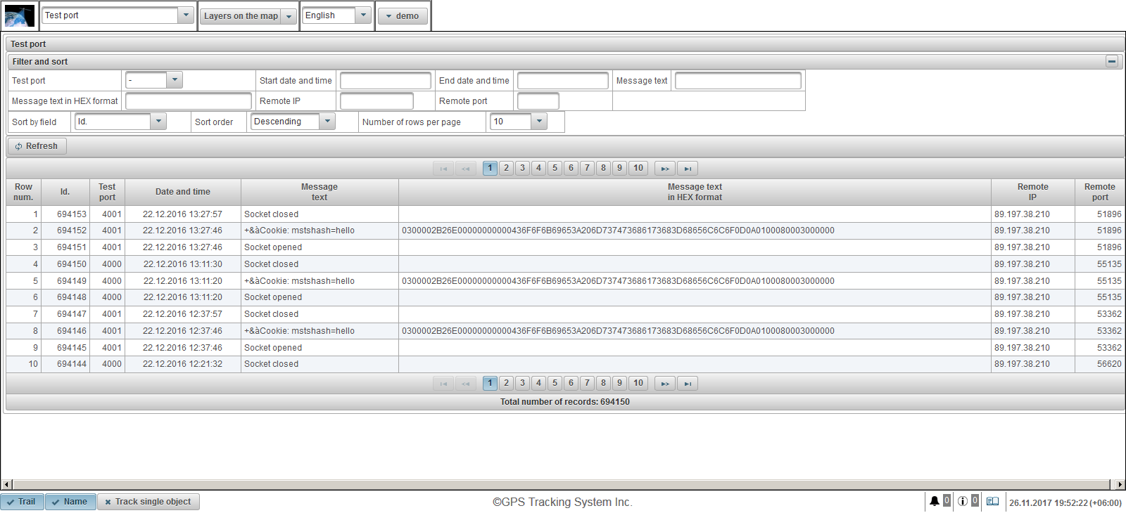 개체가 올바르게 구성되어 있으면 데이터가 시스템으로 전송되기 시작합니다. 새 메시지가 개체에서 도착하면 새 레코드가 저널에 나타납니다. 저널을 보려면 오른쪽 하단 패널에서 저널 표시 버튼을 클릭하십시오.