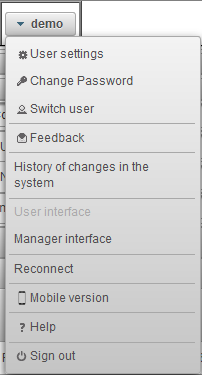 - 패널 선택, 사용 가능한 패널 목록은 사용자 권한 및 선택한 인터페이스 (사용자 인터페이스 또는 관리자 인터페이스)에 따라 다릅니다.