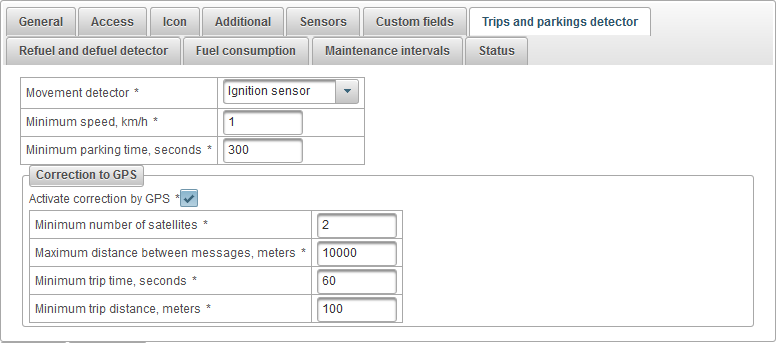 점화 센서가 켜지고 대상의 속도가 "최소 속도, km / h"필드보다 클 경우 이동이 고정됩니다.