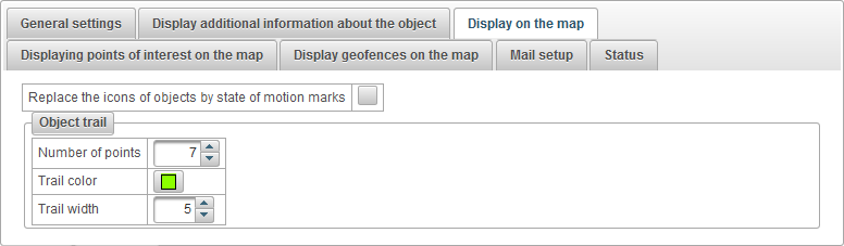 지도에서 온라인 모니터링을 할 때 추적 물이 객체를 추적하는 기간 (메시지 수에 해당하는 포인트 수)을 지정하고 트레일 색상과 너비를 선택할 수 있습니다.